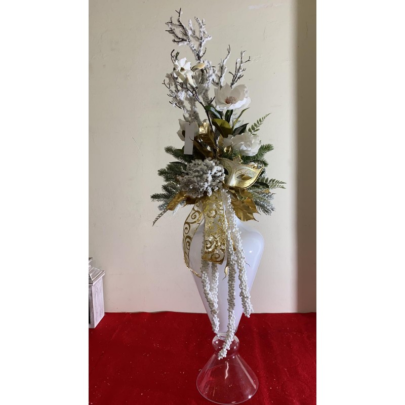 Struttura in vetro bianco su base trasparente, Alt. cm 140 con addobbo natalizio