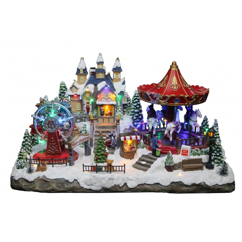 Parco giochi natalizio con luce Led, Ruota panoramica e giostra, ed albero di Natale in movimento.