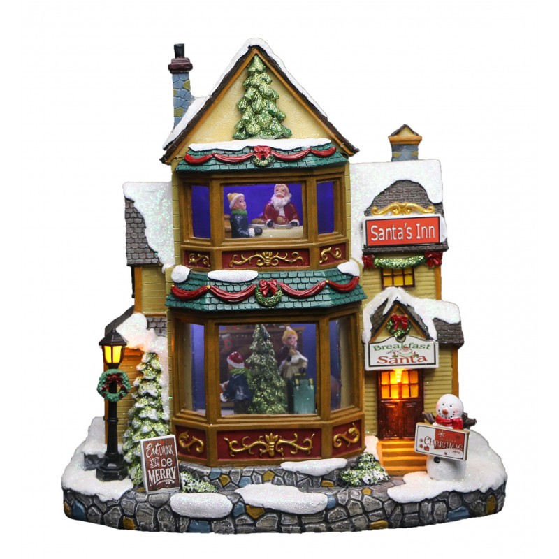 Casetta natalizia in resina con luce Led ed interno natalizio con funzione di movimento di albero e bambini.
