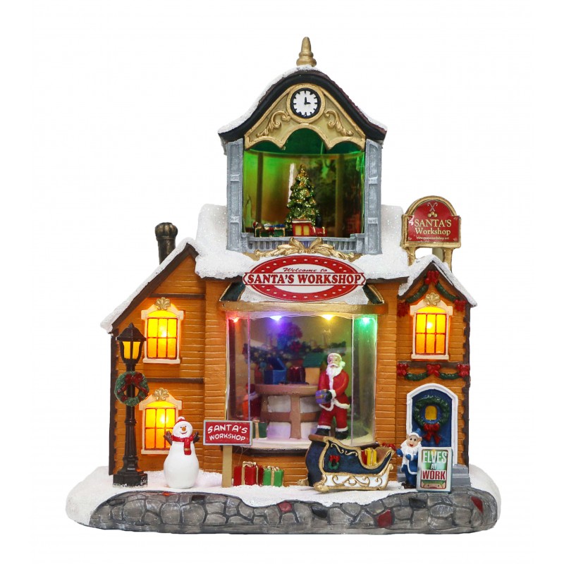 Bottega di Babbo Natale in resina con luce a Led e movimento