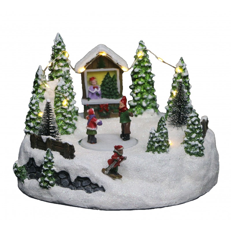 Scena di Natale in resina con luce Led e pattinaggio in movimento di bambini.
