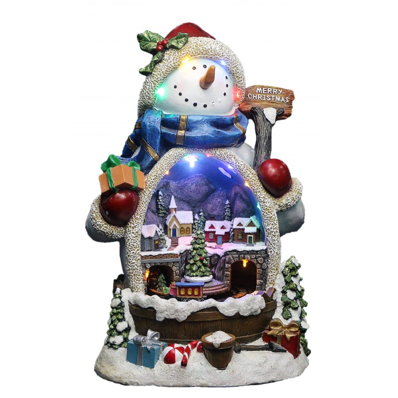 Pupazzo di neve in resina con luce a Led e all'interno paesaggio natalizio con treno e albero in movimento.